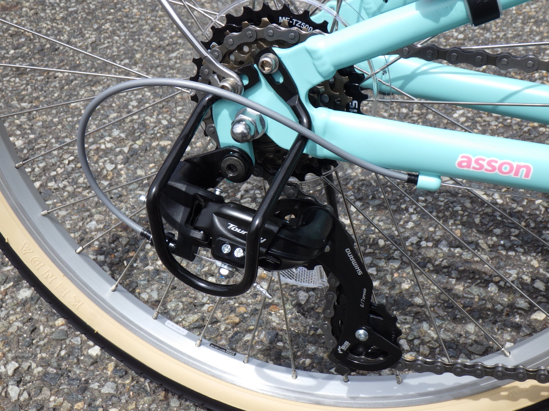 大人顔負けの充実装備 asson J シリーズはスポーツバイクの多くが採用している V ブレーキを使用し、お子様の握力でもしっかり止まることができます。また外装 6 段変速だから坂道もスイスイ進むことができ、前後の泥除けやギアカバーも付いているから泥はねや裾汚れを防ぐことができます。アクティブに外へ飛び出そう!